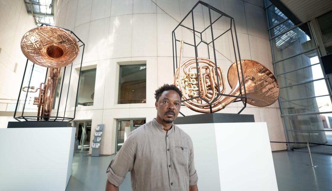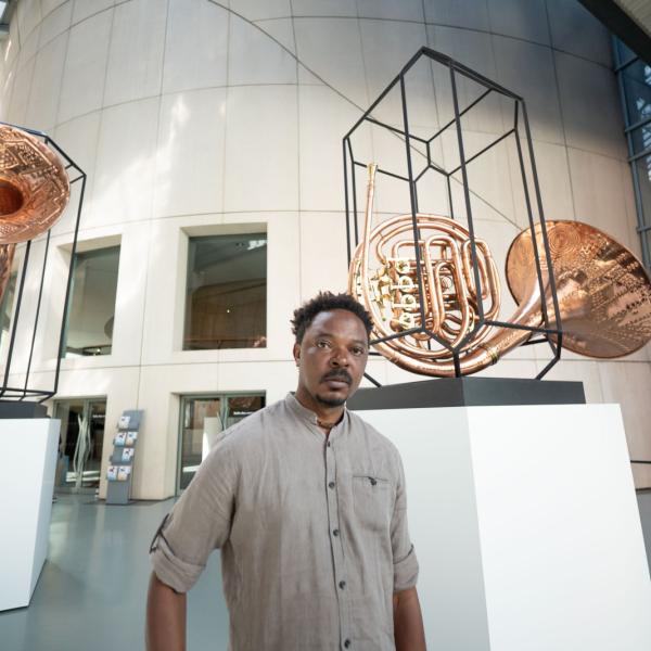 En résidence au Musée durant la saison 2023-2024, l’artiste plasticien Sammy Baloji s’est intéressé à la riche collection de sanzas africaines. Sa monumentale installation Johari – Brass Band accueille le visiteur dès l’entrée de la Cité de la musique.